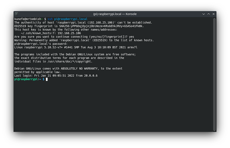 bu işlem tamamlandıktan sonra SD kartı okuyucudan çıkartıp raspberry pi a takın ve raspberry pi a enerji verin. İlk açılışta ufak işlemler yapacağı için açılması biraz uzun sürebilir. Bir süre geçtikten sonra komut satırı açıp “ping raspberrypi.local” komutunu çalıştırın. eğer cevap geliyor ise kurulum başarı ile gerçekleşmiş demektir. Bu durumda ssh ile cihaza bağlanabiliriz. “ssh pi@raspberrypi.local” komutunu girerek ssh bağlantısı kuruyoruz. Bağlantı için gerekli parola kurulum aşamasında belirlediğiniz parola olacak.