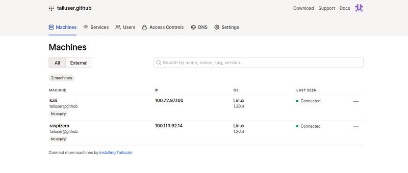 Tailscale bizlere p2p wireguard tünellei daha performanslı bir şekilde sunabilen ücretsiz bir servis. Detaylarını merak edenler bu yazıya göz atabilirler. Biz de bu servisi kullanarak el yapımı pinaple ımıza uzaktan bağlanacağız. Öncelikle Tailscale’in sitesindeki kurulum tailmatlarına uyarak Kendi sisteminize ve Raspberry pi ınıza kurulumu gerçekleştirin. Kurulumu tamamladıktan sonra Admin ekranına giriş yapın.