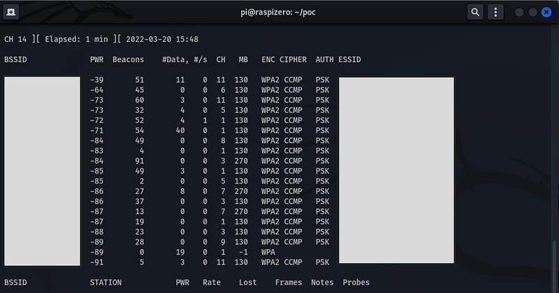 Ardından hedeflediğimiz ağın mac adressini kopyalayarak airodump ile 1. interface üzerinden dinleme başlatıyoruz ve dinlediğimiz paketleri bir dosyaya yazdırıyoruz. Bu sırada 2. interface ile de deauth paketlerini göndereceğiz.
